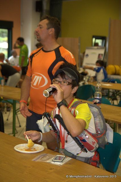 Emanuela Tonetti, a la que tengo que decir que solo vi en el avituallamiento de Gressoney, entro sola, comió sola y me pregunto cómo entrar en la zona de dormir ya que quería descansar un rato antes de continuar. No sé si tuvo más apoyos a lo largo de la carrera pero viendo como llego aquí tengo dudas de que llevase mucho más. Su forma de correr creo que es impecable, yo sola me enfrento a la carrera sin ningún tipo de ayuda externa salvo la que me facilita la organización