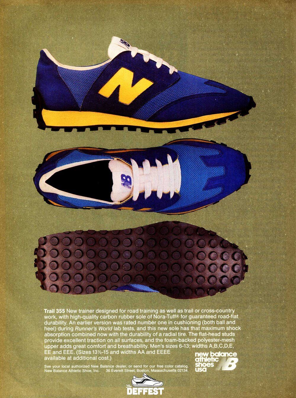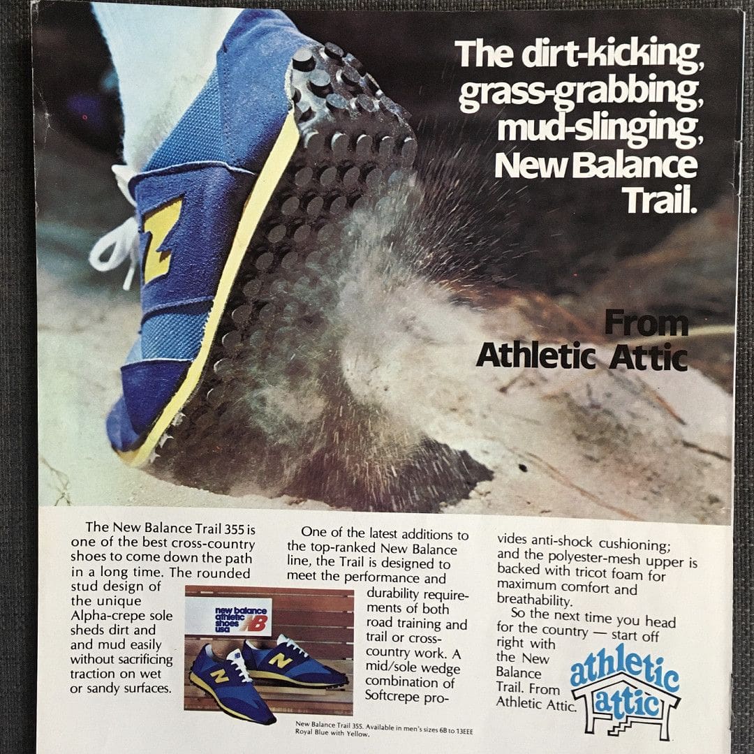 New Balance lanzó al mercado su primera zapatilla de trail en 1977, la silueta New Balance Trail 355. Diseñada para adaptarse a superficies húmedas como los caminos de Nueva Inglaterra en los que se inspiraba, su estilo fue muy bien valorado por aquellos corredores con influencias más urbanas.