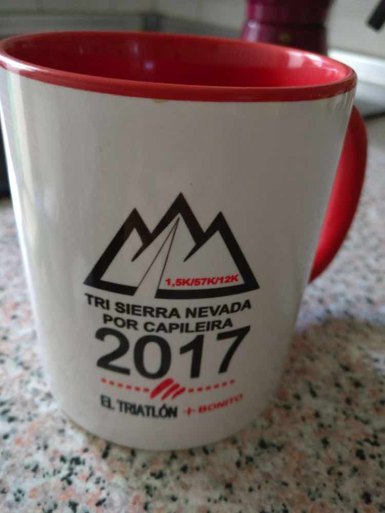 El sábado bajamos a Motril para coger el dorsal y dejar la bici. También se podía hacer el domingo a primera hora pero yo preferí hacerlo así para mi tranquilidad. La bolsa del corredor a parte del dorsal y chip contenía geles varios, gorro de natación, bolsas para la T1 y T2 y el mejor regalo, una taza conmemorativa típica en las pruebas trystrong en la que luego nos encanta desayunar.