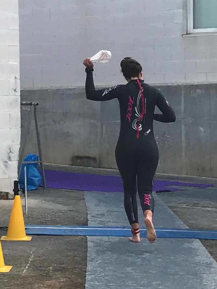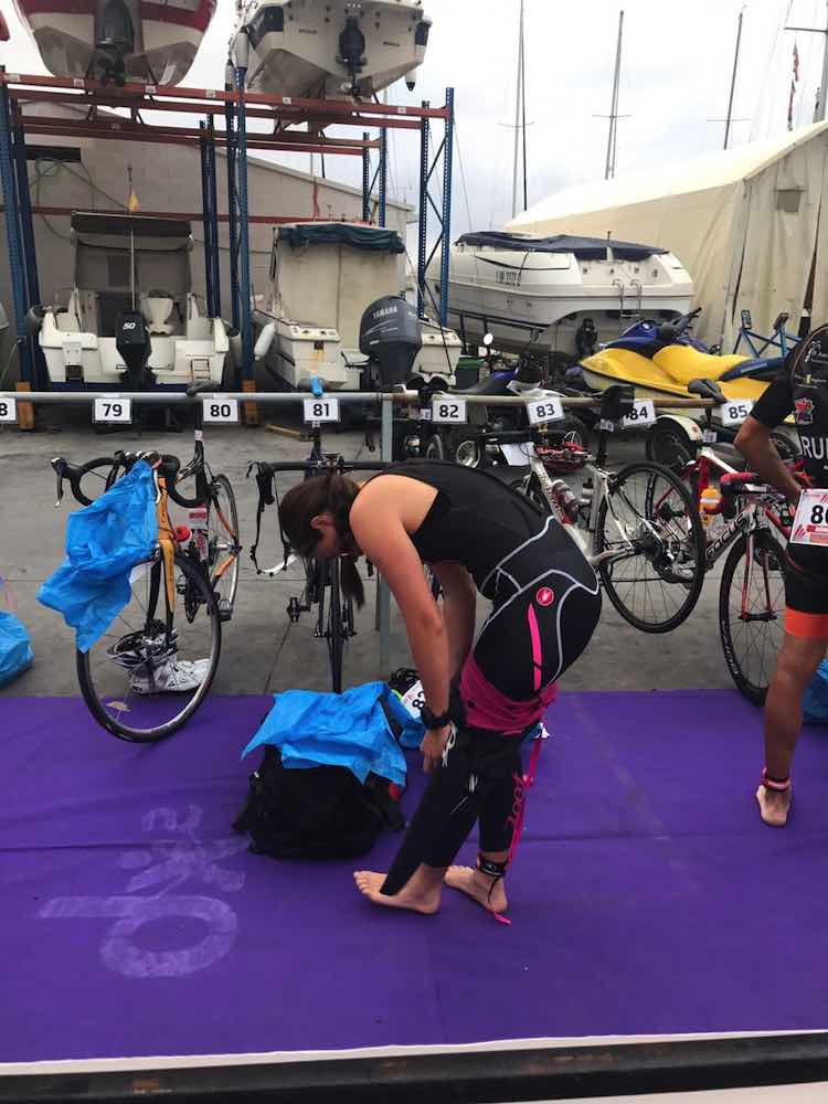 Salí del agua por una escalerilla y rápidamente me fui a coger la bici a la vez que me quitaba el neopreno. Tuve algún problemilla al quitarme el neopreno porque se enganchó la cremallera del neopreno con la cuerda para cerrar el traje de triatlón que se lleva debajo.
