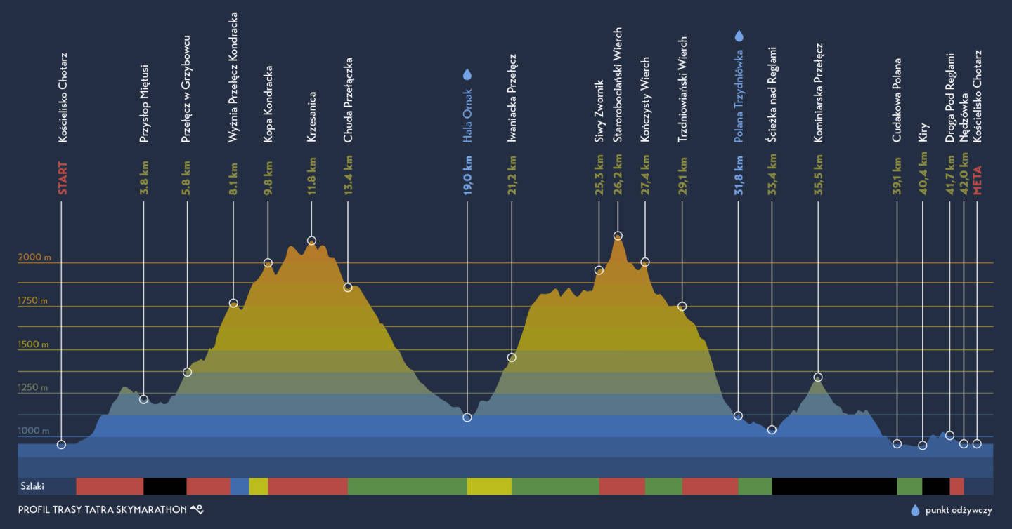 Este es uno de los cuatro picos Czerwone Wierchy (Red Peaks) de la región. Luego, la ruta desciende hasta aproximadamente 1100 m en Hala Ornak, el punto de 19 km, pero no habrá ningún respiro para los corredores, ya que luego tendrán que volver a subir 1000 m, hasta llegar a Starorobocianski Wierch, el punto más alto del recorrido, al que llegarán en el km 26,2.  Luego baja, con un último y más pequeño pinchazo en la cola, todo el camino de regreso a Kościelisko.